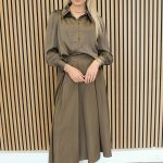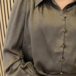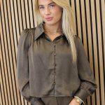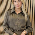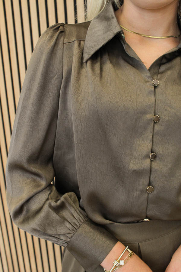Een elegante blouse in satijnlook (niet te glanzend) prachtig mooie knopen en in mooie khakigroen. Deze blouse is ook verkrijgbaar in bruin. Perfect te combineren met een hoge taille rok of pantalon.