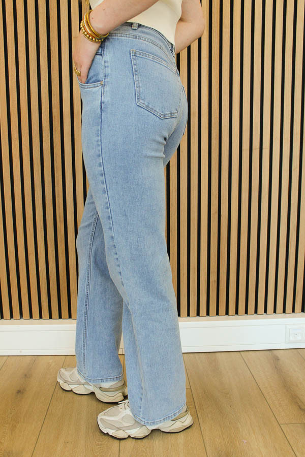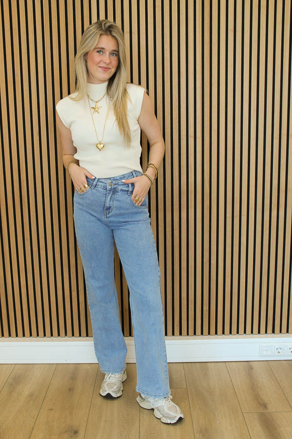Wijde jeans met hoge taille en asymmetrische ceintuur.