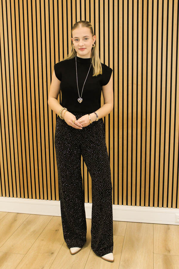 Met strass steentjes versierde rechte broek met elastische tailleband. Deze zit lekker comfy en kriebelt niet! Perfect te combineren voor een feestelijk gelegenheid!