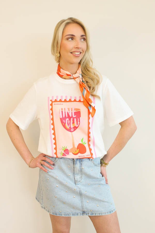 Een vrolijk T-shirt met een cocktailprint op de voorkant voor een zomerse uitstraling. Het shirt heeft een comfortabele pasvorm en is verkrijgbaar in één maat. Perfect voor een casual en zonnige look.
