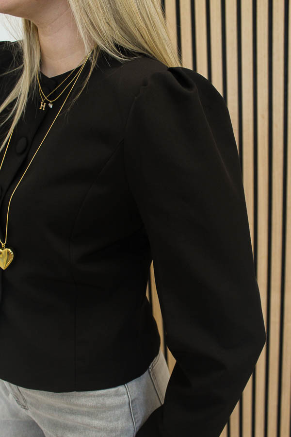 Een top-blazer met aansluitend pasvorm. Deze top kan je ook open als blazer dragen en heeft mooi knopen in dezelfde stof. Deze is verkrijgbaar in meerdere kleuren.