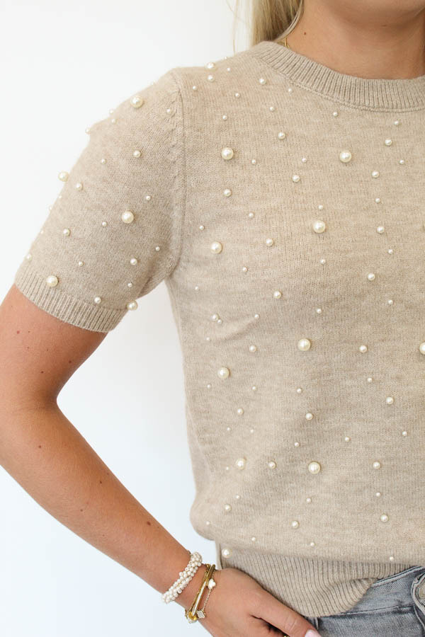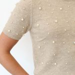 Een gebreide zachte stof truitje met korte mouwen. Deze kriebelt niet en heeft mooie parels!