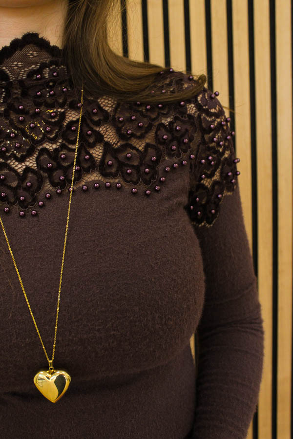 Een zachte top, voelt als een trui en kriebelt niet. Deze heeft lange mouwen en kant met parels aan de bovenkant.