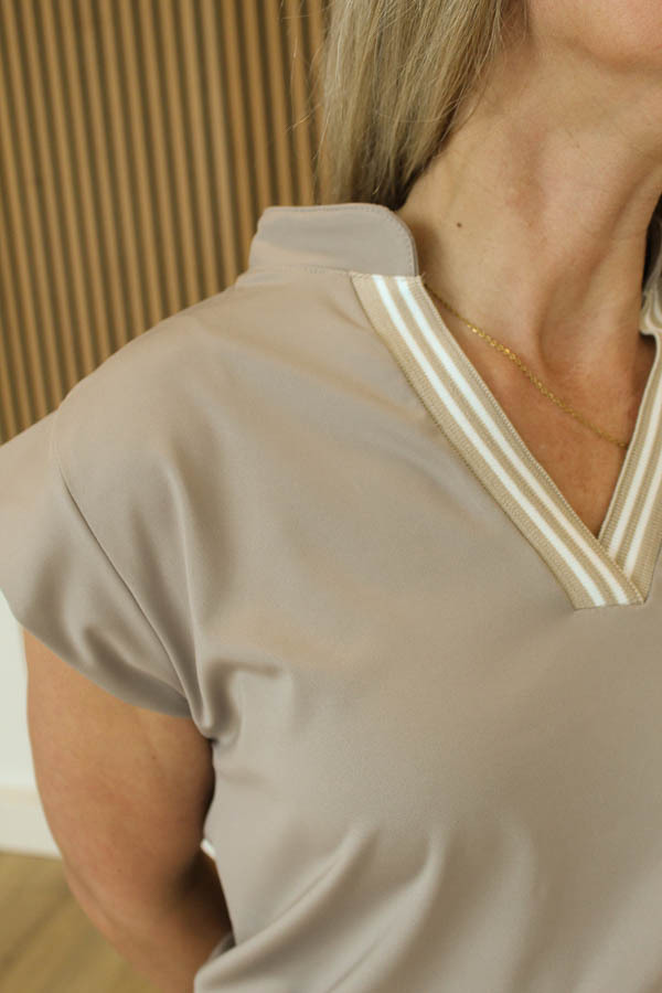 Deze top is met een elegante V-hals en kapmouwtje. De top is vervaardigd uit kwaliteitsvolle travelstof. We hebben ze in verschillende kleuren en ook bijpassend rokje als set te combineren!