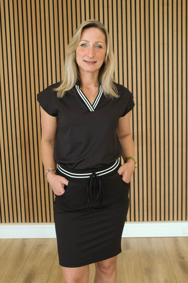 Deze top is met een elegante V-hals en kapmouwtje. De top is vervaardigd uit kwaliteitsvolle travelstof. We hebben ze in verschillende kleuren en ook bijpassend rokje als set te combineren!