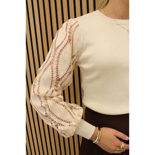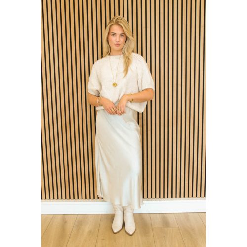Een fijngebreide truitje met lurex (glitter) in verwerkt. Deze heeft knoopjes en volant mouwen. Heel erg leuk te combineren voor een feestelijk gelegenheid of straks met de feestdagen voor op een pantalon of rok!