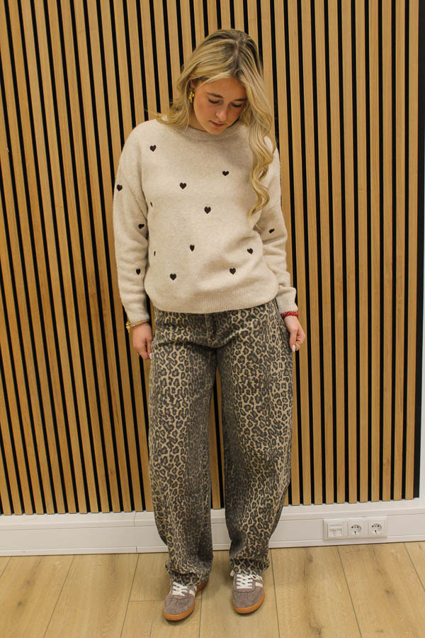 Mooie beige trui met ronde hals en lange mouwen en geborduurde hartjes in bruin. Deze is verkrijgbaar in meerdere kleuren. Een bestseller uit onze winkel!