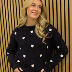 Mooie navy blauwe trui met ronde hals en lange mouwen en geborduurde hartjes in wit. Deze is verkrijgbaar in meerdere kleuren. Een bestseller uit onze winkel!