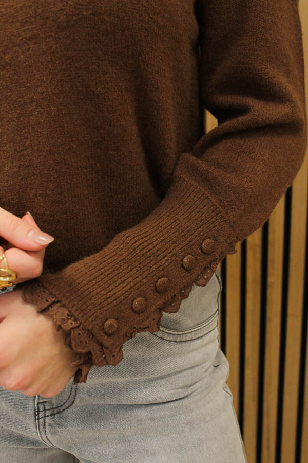 Mooie trui met hoge hals en kanten details bij de kraag en mouwtjes. Deze is verkrijgbaar in meerdere kleuren en een bestseller uit onze winkel!
