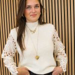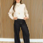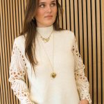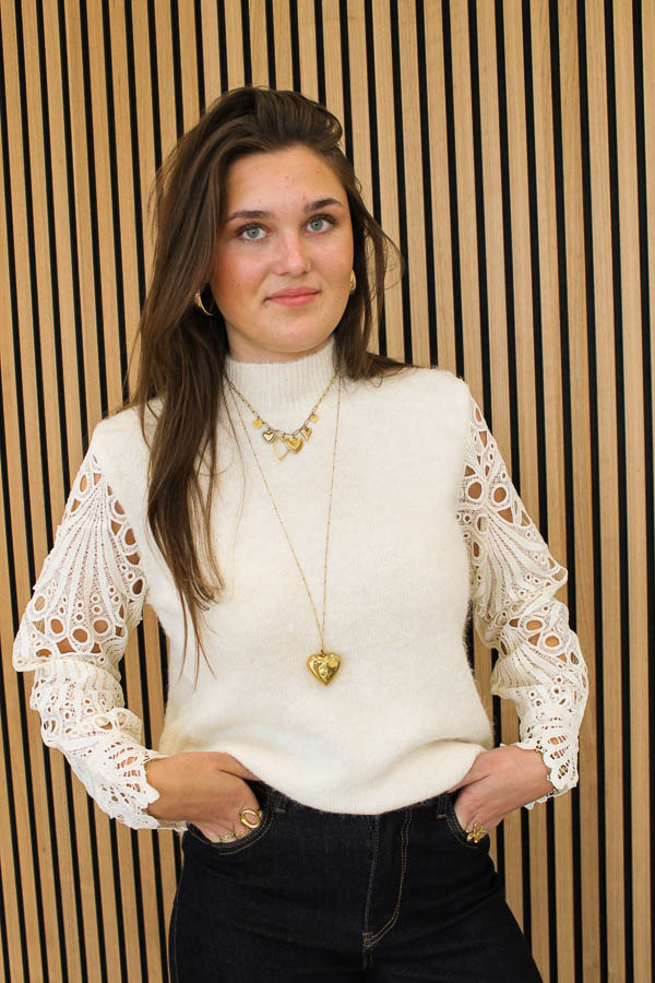 Een trui met zachte stof met hoge hals en getrimd aan de onderkant waarmee je de trui kunt blousen. Trui heeft als eyecather prachtige mouwen met kant.