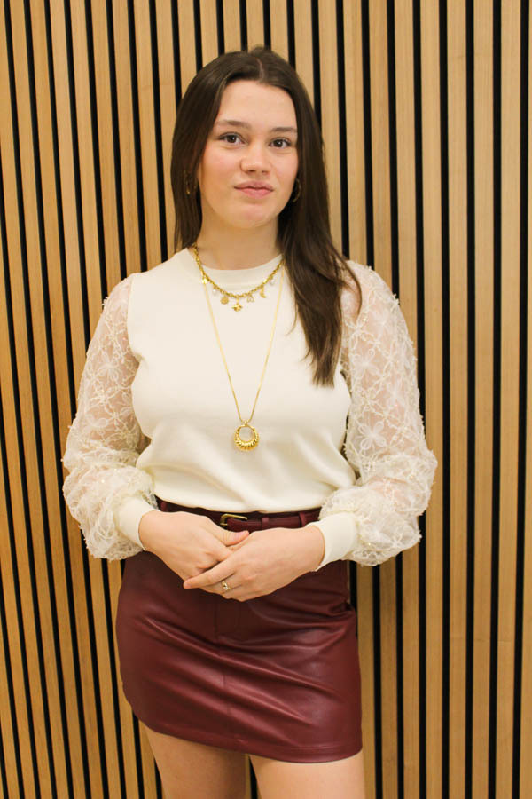 Een fijngebreide trui met pofmouwen van tule, versierd met subtiele pailletten. De zachte stof en sprankelende mouwen geven elke outfit een stijlvolle, vrouwelijke touch.