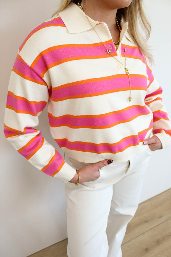 Deze warme gestreepte trui combineert comfort met een elegante uitstraling. De trui is afgewerkt met een verfijnde kanten hals, wat zorgt voor een vrouwelijk en stijlvol detail.