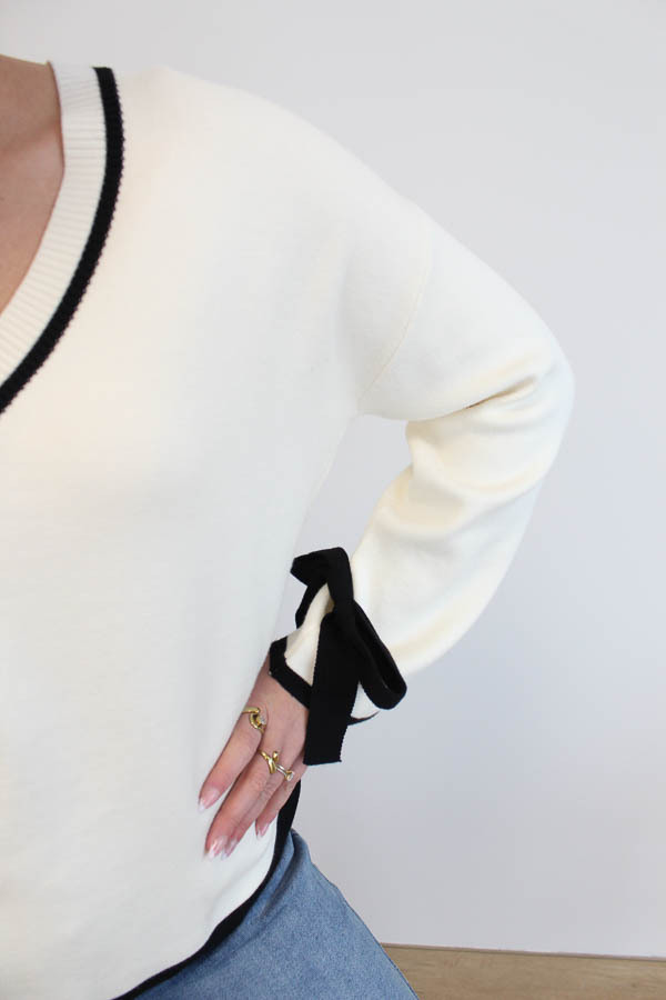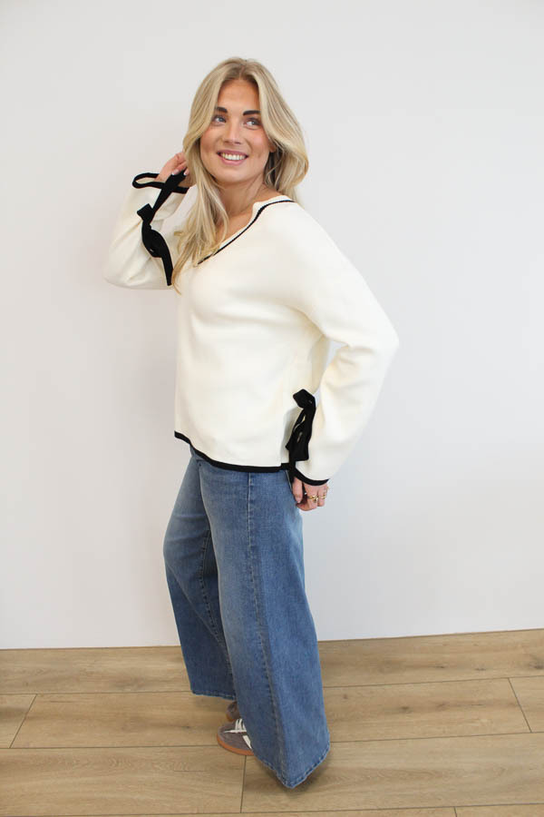 Een super leuke tricot trui met v-hals en lange wijde mouwen. Deze trui heeft strik details bij de mouwen die hem zo leuk maakt!