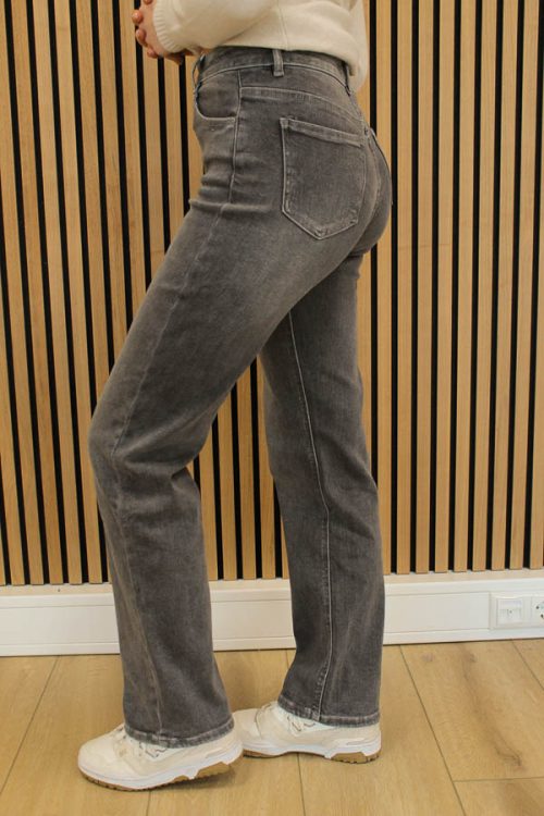 Beige wide leg jeans met sierlijke knopen en zakken aan de voorkant. Deze broek zit als gegoten en heeft brede riemlussen.