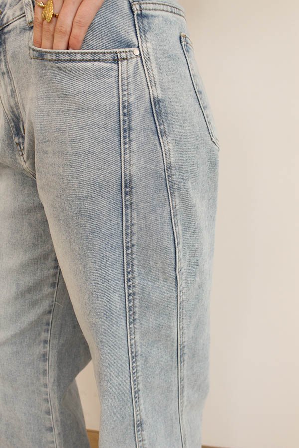 Een mooie wide leg jeans met een stijlvol detail aan de zijkant voor een unieke uitstraling. De broek heeft zowel voor- als achterzakken en een comfortabele pasvorm. Perfect voor een trendy en moderne look.