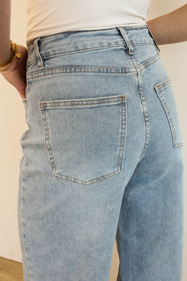 Bestseller jeans nu in een nieuwe kleur: licht blauw! Deze wide leg jeans verkopen wij heel erg goed, ook verkrijgbaar in donkerblauw. Deze heeft een goede pasvorm en lekker stretch. Deze wide leg heeft een stiksel aan de voorkant wat deze jeans helemaal uniek maakt! Een bestseller jeans uit onze winkel! Verkrijgbaar in meerdere kleuren!