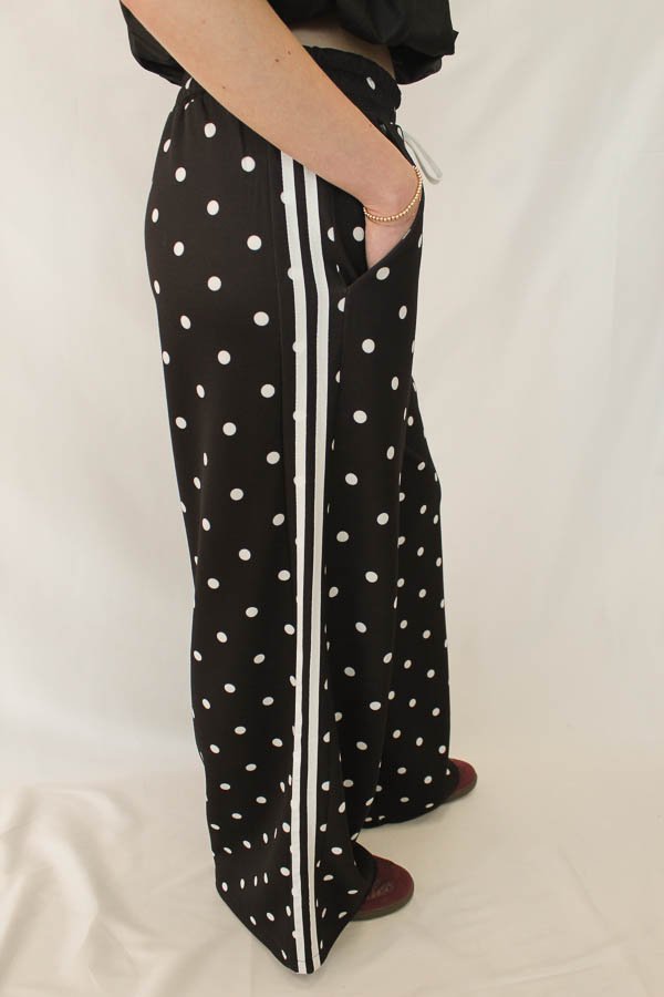 Deze zwarte wide leg broek met witte stippen combineert moeiteloos comfort en stijl. De luchtige stof en losse pasvorm zorgen voor een elegante flow, terwijl de speelse polkadot print en sportieve zijstreep een moderne twist geven. De elastische tailleband met strikkoord biedt een perfecte pasvorm en extra draagcomfort. Ideaal voor zowel een casual look met sneakers als een meer geklede outfit met hakken.