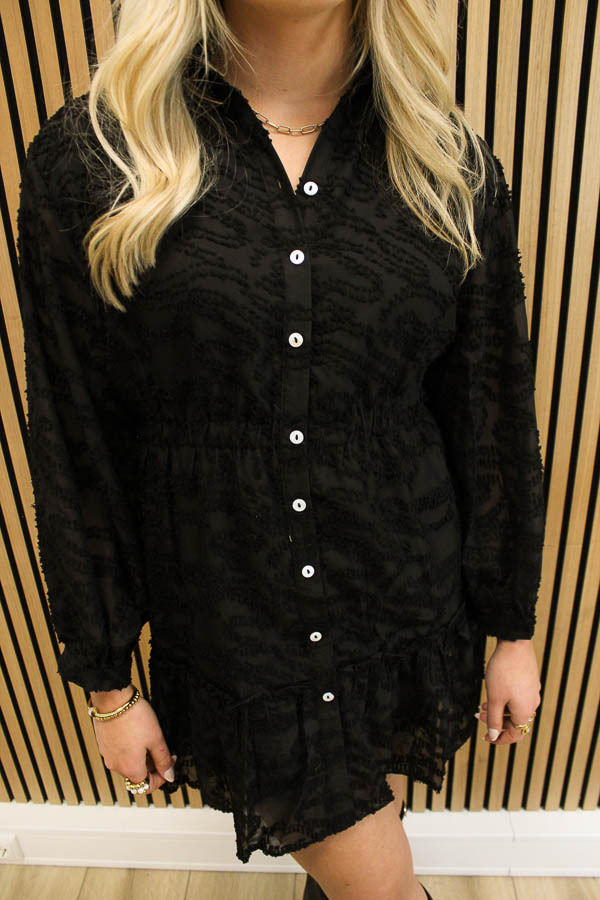 Een prachtige jurk voor een feestelijk gelegenheid met pof mouwen, elastische tailleband en mooi motief stofje.